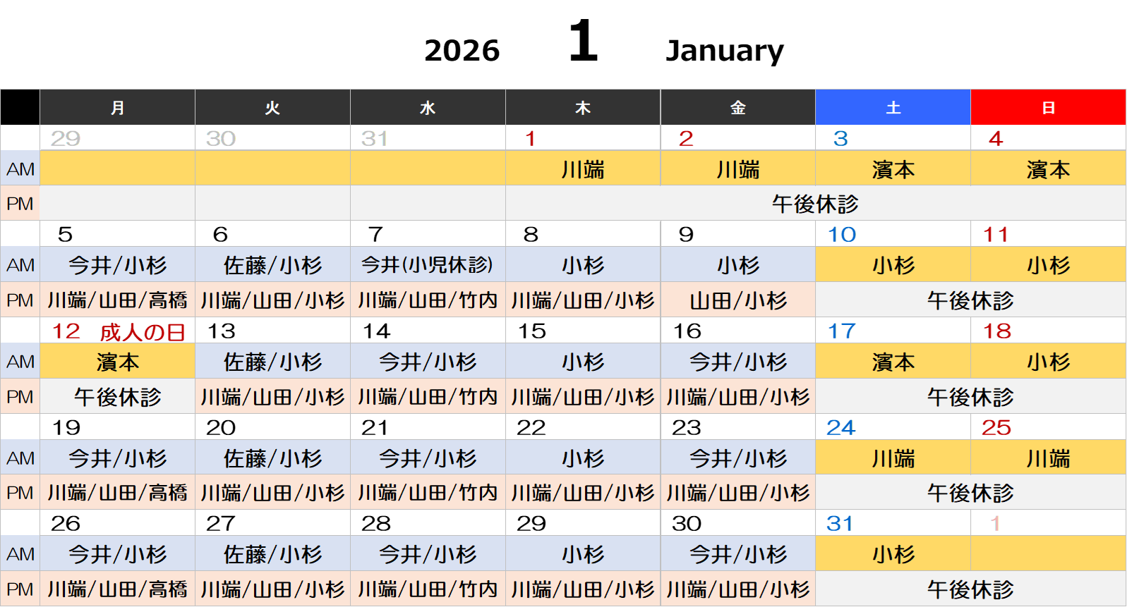 1月2月の外来診療医と、土日祝の小児科対応日、休診日のお知らせ
