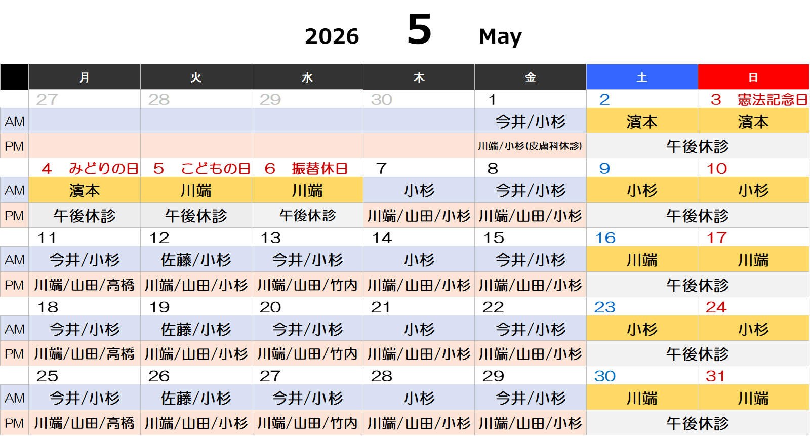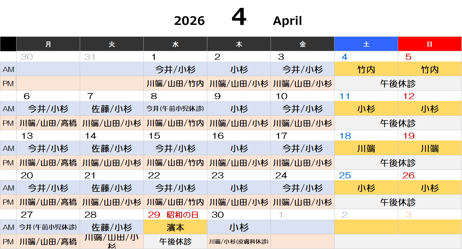 公開日:2026年03月17日 4月5月の外来診療医と、土日祝の小児科対応日、休診日のお知らせ 4月 8日(水) 小杉医師 休診(午前小児科休診) 4月27日(月) 小杉医師 休診(午前小児科休診) 4月30日(木) 山田医師 休診(皮膚科休診) 5月 1日(金) 山田医師 休診(皮膚科休診)