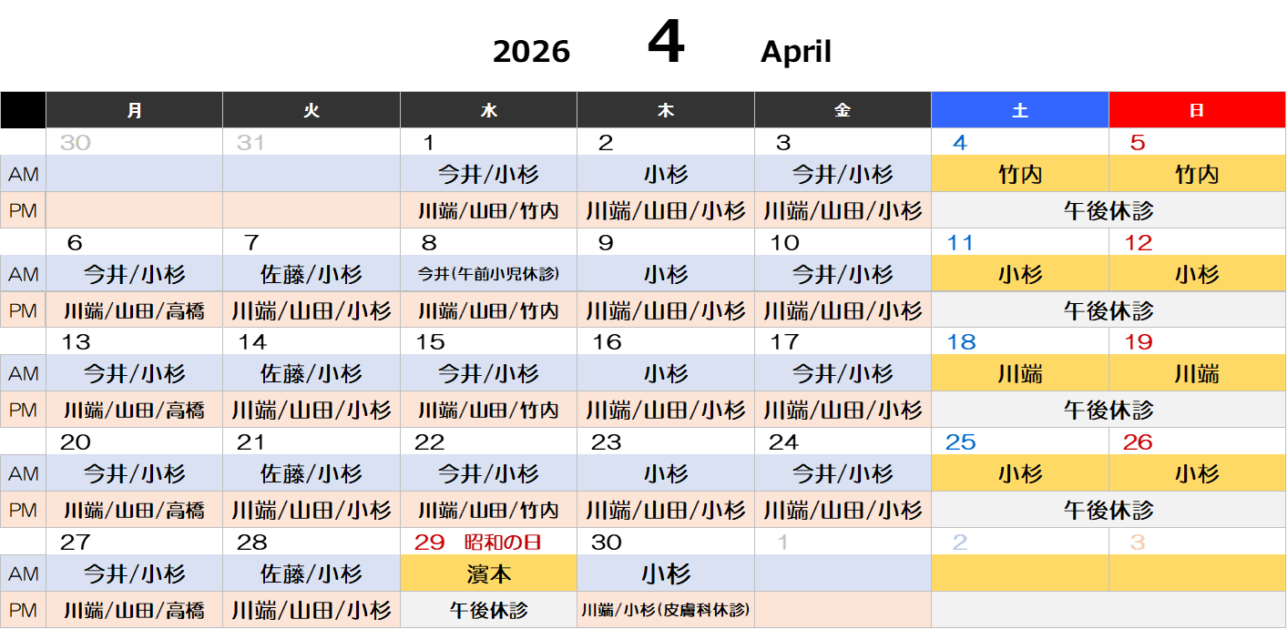 ※医師の休診予定は「新着情報」にてご確認ください。